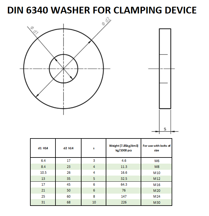 DIN 6340 defines plain washers designed for high-strength bolted connections, especially in precision engineering and mechanical applications. These washers are thicker and larger in diameter compared to standard washers, providing better load distribution and increased resistance to deformation.