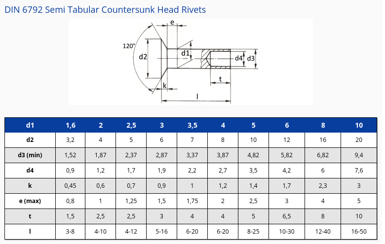 🔹 DIN 6792 Rivet Dimensions (mm)